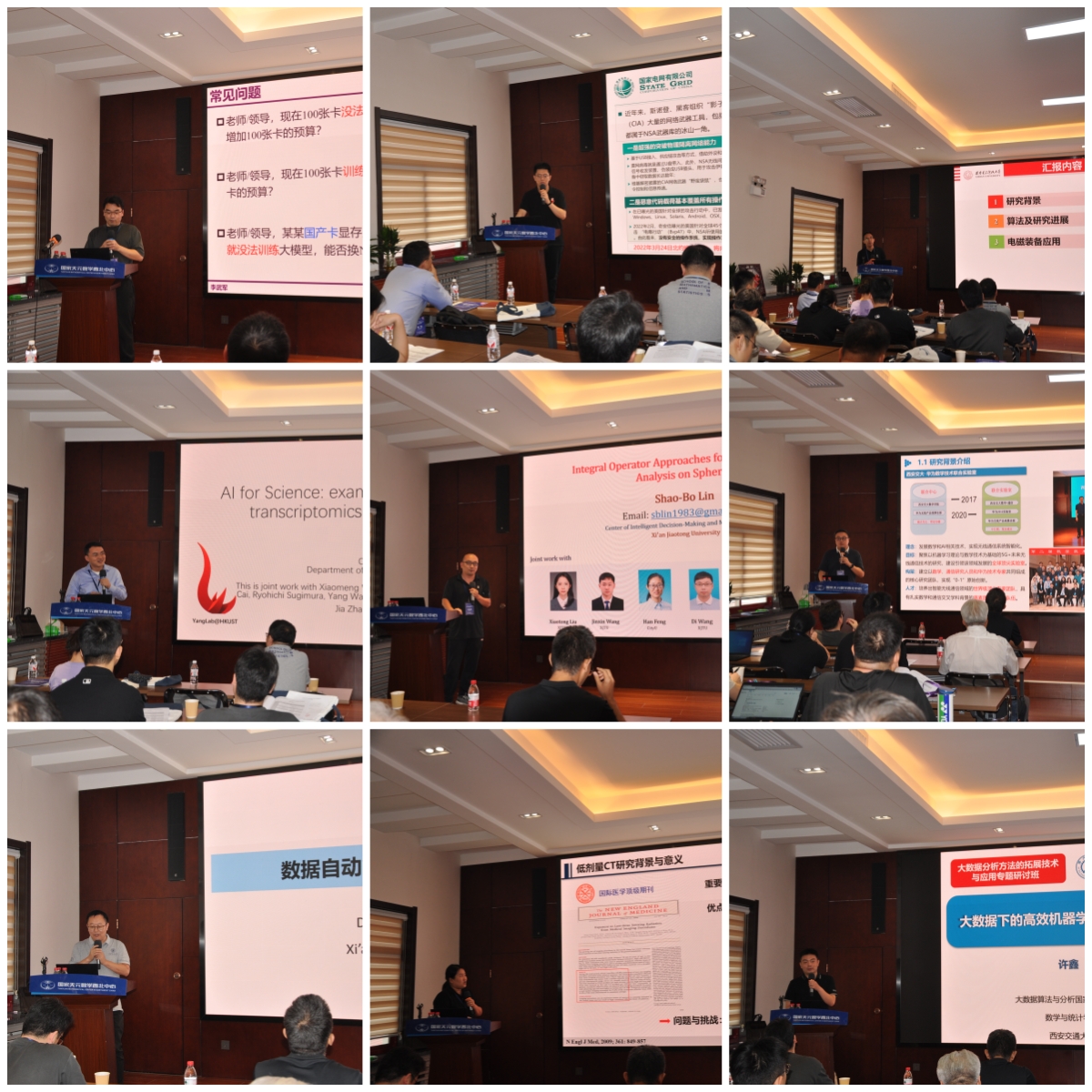 在接下来的会议中,南京大学的李武军、香港科技大学的杨灿、南方医科大学的张华、西安电子科技大学的张立、国网智能电网研究院有限公司的王云帆,以及西安交通大学的孟德宇、林绍波、薛江、许鑫等九位专家相继作了精彩的学术报告。报告内容涵盖了高效能分布式机器学习、基于大数据分析的电力系统网络攻击感知与防御技术、超算环境下的稠密线性方程组求解基础算法、大规模人群生物库数据、智能空口关键数学技术、数据筛选、智能低剂量CT成像技术、大数据下的高效机器学习框架构建技术等多个领域。与会学者们就报告的内容及外延展开了热烈的讨论。例如,在智慧医疗领域,他们探讨了如何利用这些技术建立精准的医疗模型,实现对病情的预测和诊断;在智能通信领域,讨论了如何更好地理解和分析用户行为,优化网络结构和资源分配;在电磁装备和电网安全领域,探讨了如何监测和预测设备故障和电网安全风险。